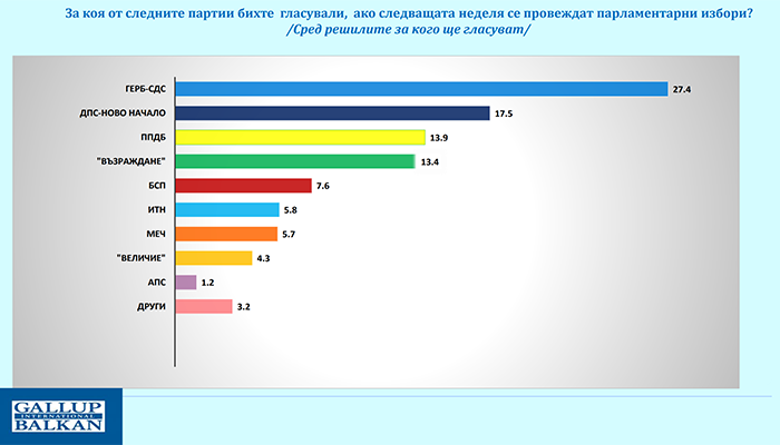 Сред решилите за кого ще гласуват ГЕРБ–СДС запазва убедителна водеща позиция с 27,4% подкрепа (при 25,7% през юли) – най-висок резултат от началото на годината. Значение за укрепването на електоралната подкрепа на формацията има дейността на правителството, последователната работа по ключови теми като присъединяването към еврозоната, изпълнението на Плана за възстановяване и устойчивост, поддържането на икономическа стабилност.
