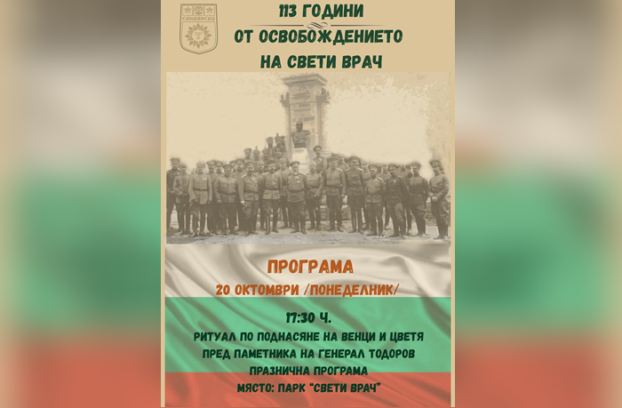 На 20 октомври Сандански ще отбележи 113 години от Освобождението на Свети Врач – денят, в който отряд на Седма Рилска дивизия влиза в града и поставя началото на новата му история.