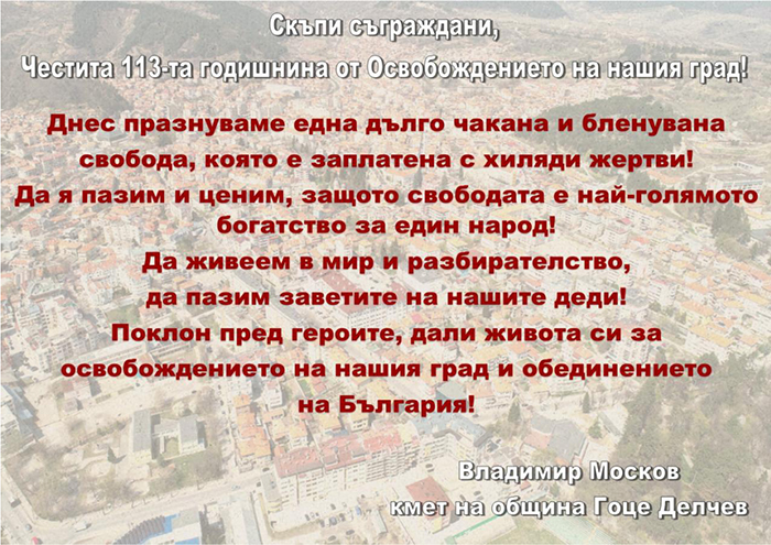 Кметът на Гоце Делчев, Владимир Москов: Честита 113-годишнина от освобождението на нашия град!