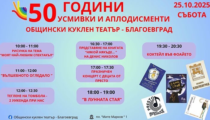 Общинският куклен театър в Благоевград ще отбележи 50 години от създаването си с празнична програма, включваща поредица от събития за деца и възрастни.