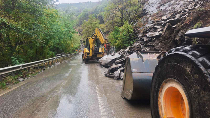 Екипи на пътноподдържащата фирма разчистват свлечената скална и земна маса в района на Асеновград на второкласния път II-86 Смолян – Асеновград, съобщиха от АПИ.