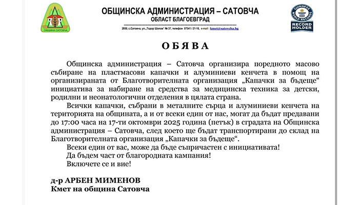Общинската администрация в Сатовча организира поредното масово събиране на пластмасови капачки и алуминиеви кенчета в помощ на организираната от благотворителната организация „Капачки за бъдеще  инициатива за набиране на средства за медицинска техника за детски, родилни и неонатологични отделения в цялата страна.