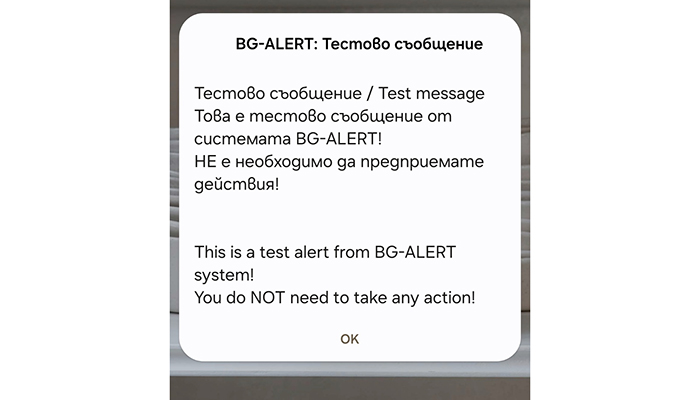 В 11 ч. телефоните, предварително въвели настройки, получиха съобщение, че се извършва тест със писмен – на български и английски, звуков и вибрационен сигнал.