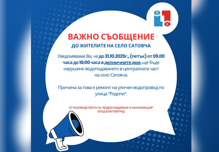 Във връзка с ремонт на уличен водопровод по ул. „Родопи“ в Сатовча, до 31.10.2025 г. (петък), в часовия диапазон от 09:00 до 16:00 часа, ще бъде нарушено водоподаването в централната част на селото.